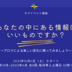 2021年10月28日 / 最終更新日時 : 2021年11月25日 事務局 オパイベント あなたの中にある情報はいいものですか?-第1回@オンライン/講師:小塚友美 日時: 2021年11月6日 @ 12:00 PM – 1:00 PM 場所: オンライン(zoom) ●対象者:どなたでも ●定員:なし ●料金:2,000円/1時間 ×8回シリーズ(動画配信付き) 詳しくはこちら ≫ お申込みはこちら ≫
